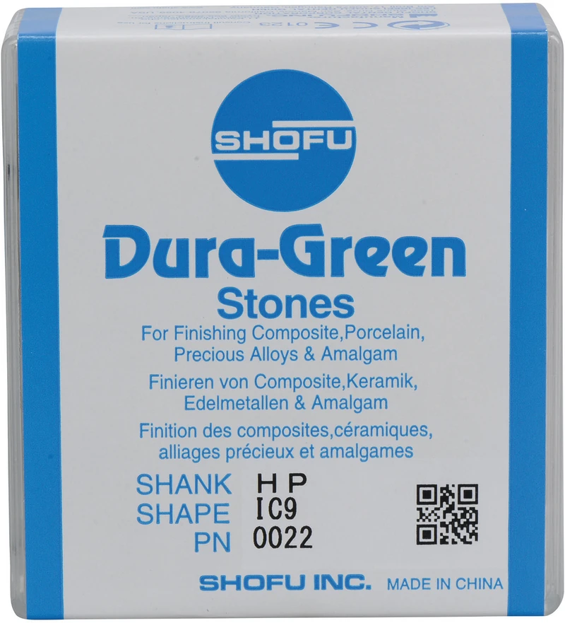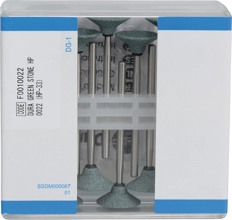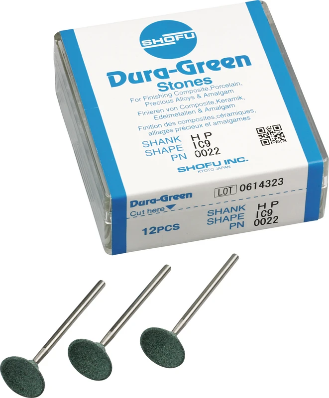 Dura-Green-Steine eignen sich hervorragend zum splitterfreien Ausarbeiten von Keramik, Komposit, Edelmetall und Amalgam. Empfohlene Drehzahl 5.000 - 20.000 U/min., max. Drehzahl 30.000 U/min. / AD 3 - 5 N.