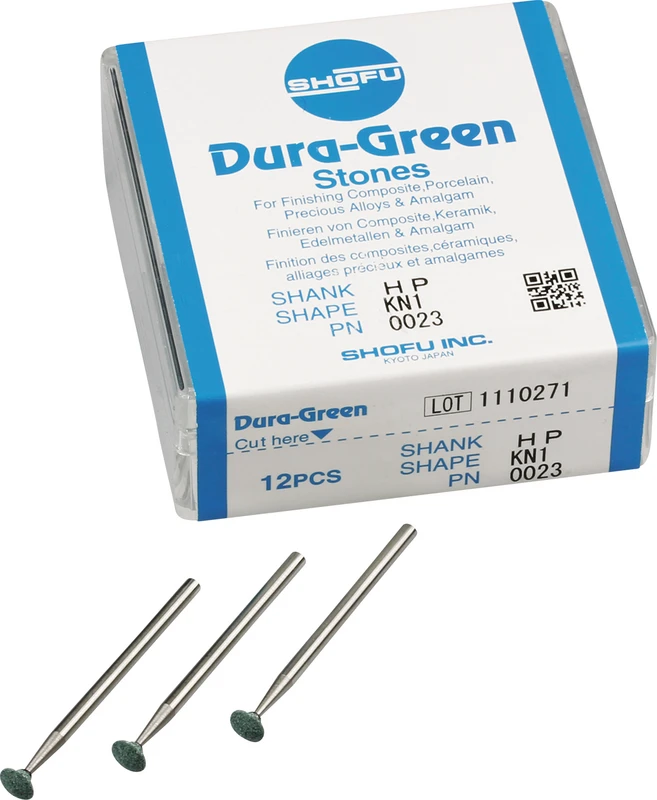 Dura-Green-Steine eignen sich hervorragend zum splitterfreien Ausarbeiten von Keramik, Komposit, Edelmetall und Amalgam. Empfohlene Drehzahl 5.000 - 20.000 U/min., max. Drehzahl 30.000 U/min. / AD 3 - 5 N.