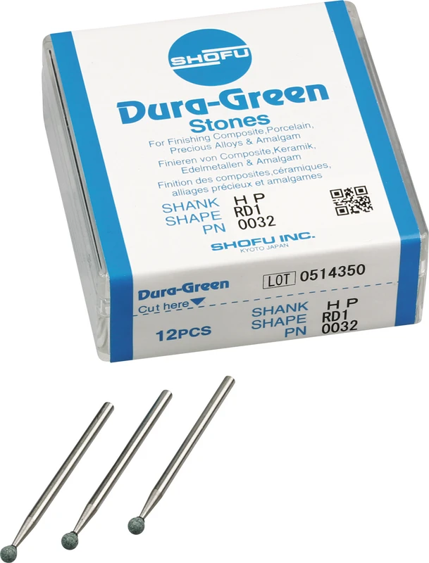 Dura-Green-Steine eignen sich hervorragend zum splitterfreien Ausarbeiten von Keramik, Komposit, Edelmetall und Amalgam. Empfohlene Drehzahl 5.000 - 20.000 U/min., max. Drehzahl 30.000 U/min. / AD 3 - 5 N.