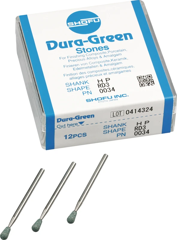 Dura-Green-Steine eignen sich hervorragend zum splitterfreien Ausarbeiten von Keramik, Komposit, Edelmetall und Amalgam. Empfohlene Drehzahl 5.000 - 20.000 U/min., max. Drehzahl 30.000 U/min. / AD 3 - 5 N.