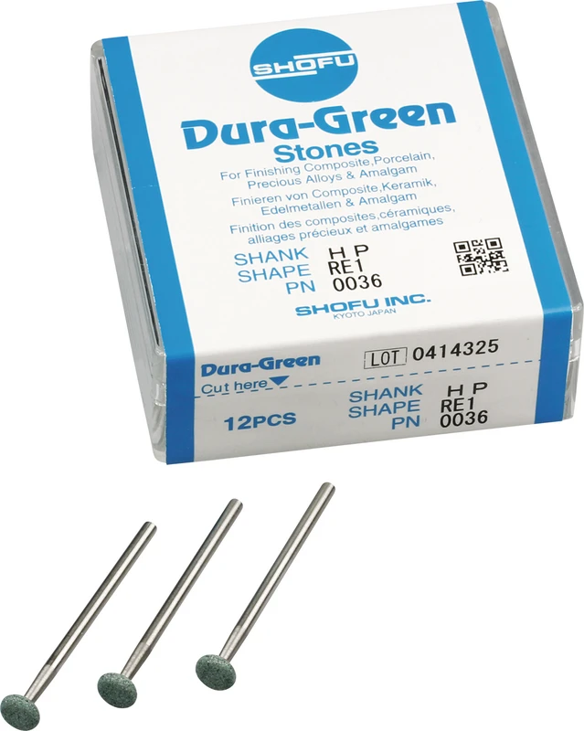 Dura-Green-Steine eignen sich hervorragend zum splitterfreien Ausarbeiten von Keramik, Komposit, Edelmetall und Amalgam. Empfohlene Drehzahl 5.000 - 20.000 U/min., max. Drehzahl 30.000 U/min. / AD 3 - 5 N.