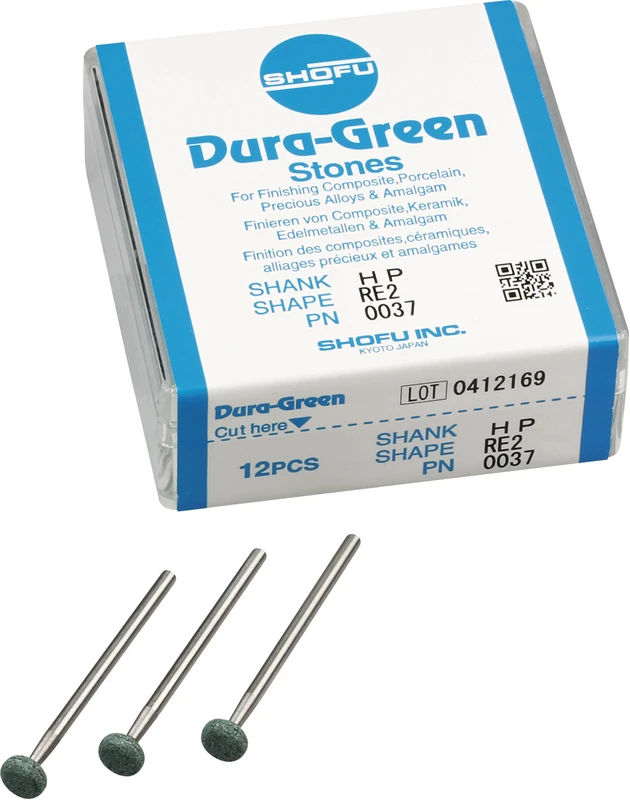 Dura-Green-Steine eignen sich hervorragend zum splitterfreien Ausarbeiten von Keramik, Komposit, Edelmetall und Amalgam. Empfohlene Drehzahl 5.000 - 20.000 U/min., max. Drehzahl 30.000 U/min. / AD 3 - 5 N.