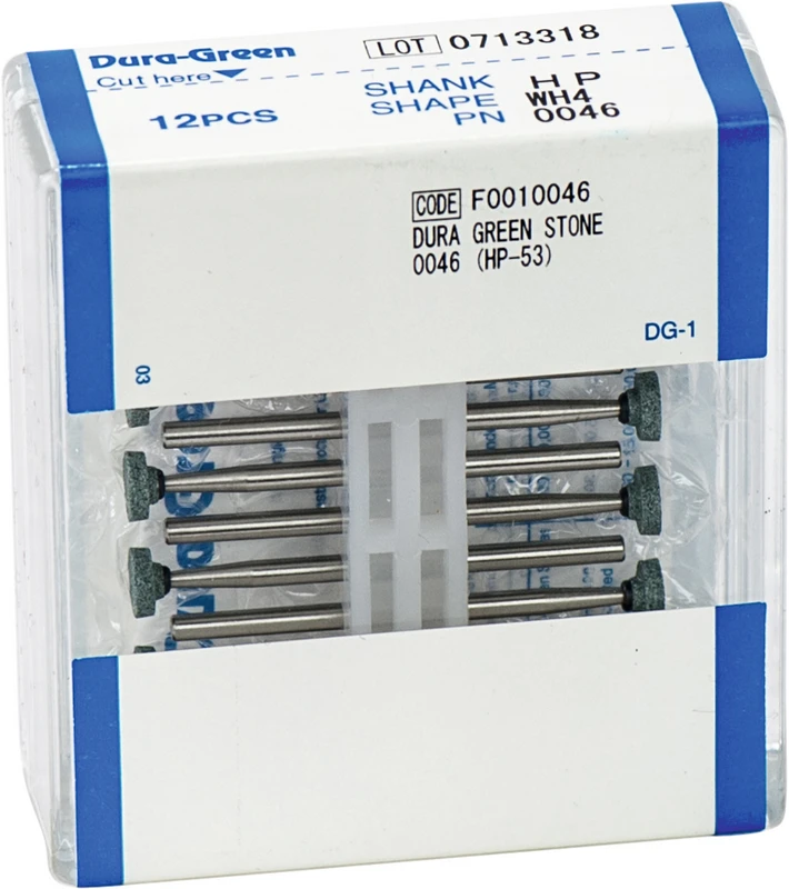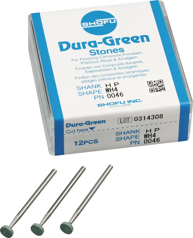 Dura-Green-Steine eignen sich hervorragend zum splitterfreien Ausarbeiten von Keramik, Komposit, Edelmetall und Amalgam. Empfohlene Drehzahl 5.000 - 20.000 U/min., max. Drehzahl 30.000 U/min. / AD 3 - 5 N.