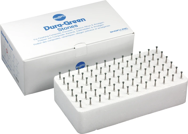 Dura-Green-Steine eignen sich hervorragend zum splitterfreien Ausarbeiten von Keramik, Komposit, Edelmetall und Amalgam. Empfohlene Drehzahl 5.000 - 20.000 U/min., max. Drehzahl 30.000 U/min. / AD 3 - 5 N.