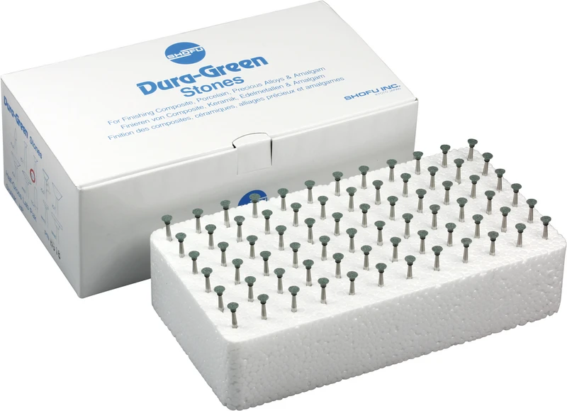 Dura-Green-Steine eignen sich hervorragend zum splitterfreien Ausarbeiten von Keramik, Komposit, Edelmetall und Amalgam. Empfohlene Drehzahl 5.000 - 20.000 U/min., max. Drehzahl 30.000 U/min. / AD 3 - 5 N.