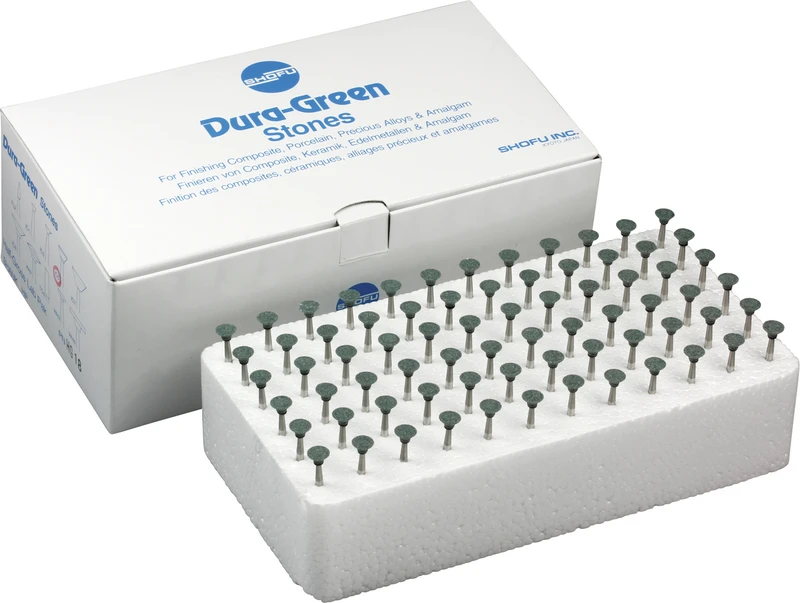 Dura-Green-Steine eignen sich hervorragend zum splitterfreien Ausarbeiten von Keramik, Komposit, Edelmetall und Amalgam. Empfohlene Drehzahl 5.000 - 20.000 U/min., max. Drehzahl 30.000 U/min. / AD 3 - 5 N.