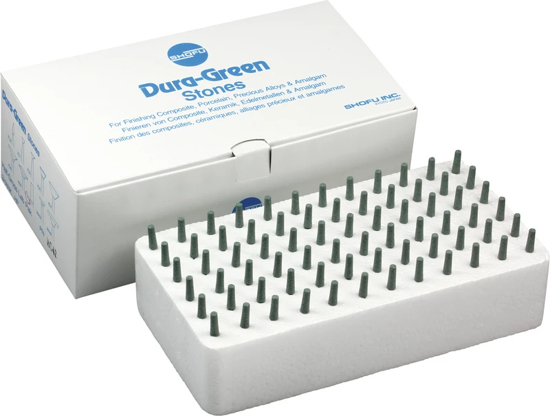 Dura-Green-Steine eignen sich hervorragend zum splitterfreien Ausarbeiten von Keramik, Komposit, Edelmetall und Amalgam. Empfohlene Drehzahl 5.000 - 20.000 U/min., max. Drehzahl 30.000 U/min. / AD 3 - 5 N.