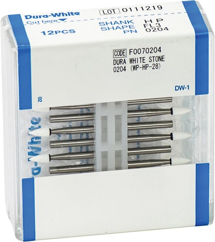 Die mikrogekörnten Dura-White-Steine aus Aluminiumoxid (Arkansas) sind unübertroffen beim Finieren von Zahnschmelz, präparierten Zahnstümpfen, Kompositen, Keramik und Glasionomer-Zementen. Empfohlene Drehzahl 5.000 - 20.000 U/min., max. Drehzahl 30.000 U/min. / AD 2 N.