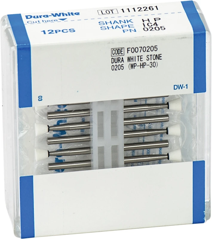 Die mikrogekörnten Dura-White-Steine aus Aluminiumoxid (Arkansas) sind unübertroffen beim Finieren von Zahnschmelz, präparierten Zahnstümpfen, Kompositen, Keramik und Glasionomer-Zementen. Empfohlene Drehzahl 5.000 - 20.000 U/min., max. Drehzahl 30.000 U/min. / AD 2 N.