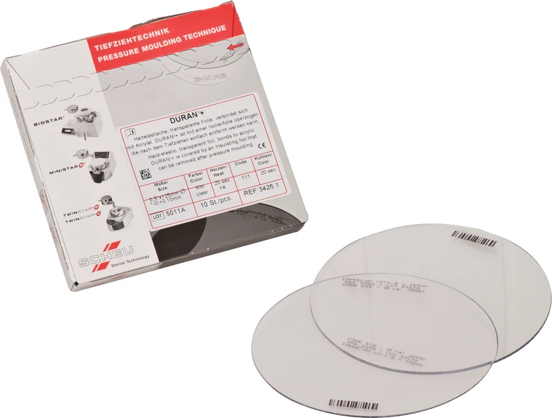 Mit der DURAN®+ wird die Produktgruppe von DURAN® um eine Tiefziehfolie mit aufgebrachter Isolierfolie ergänzt. Der Tiefziehvorgang verringert sich um einen Schritt, da vorab keine separate Isolierfolie mehr tiefgezogen werden muss. Das hartelastische, transparente Material verbindet sich gut mit Autopolymerisaten (z. B. DURASPLINT) und eignet sich für Miniplast-, Aufbiss-, Interims- sowie Fluoridierungsschienen, Röntgenschablonen, Schnarchtherapiegeräte, provisorische Kronen und Brücken.