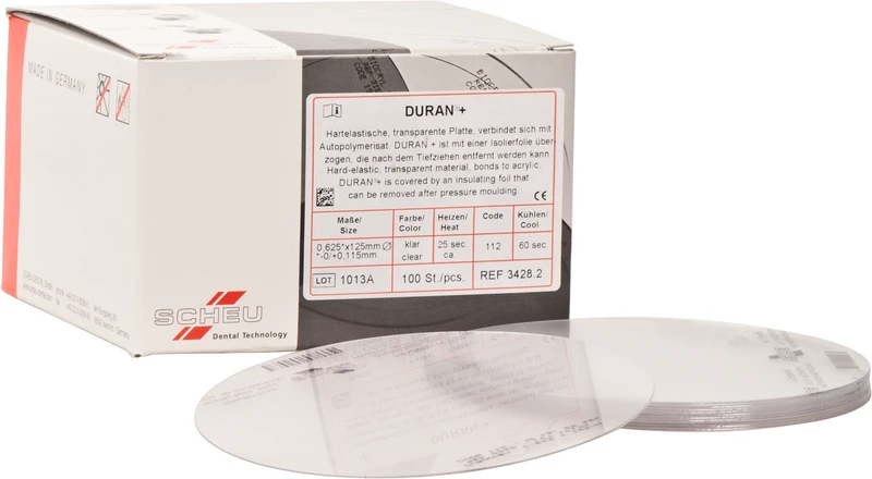 Mit der DURAN®+ wird die Produktgruppe von DURAN® um eine Tiefziehfolie mit aufgebrachter Isolierfolie ergänzt. Der Tiefziehvorgang verringert sich um einen Schritt, da vorab keine separate Isolierfolie mehr tiefgezogen werden muss. Das hartelastische, transparente Material verbindet sich gut mit Autopolymerisaten (z. B. DURASPLINT) und eignet sich für Miniplast-, Aufbiss-, Interims- sowie Fluoridierungsschienen, Röntgenschablonen, Schnarchtherapiegeräte, provisorische Kronen und Brücken.