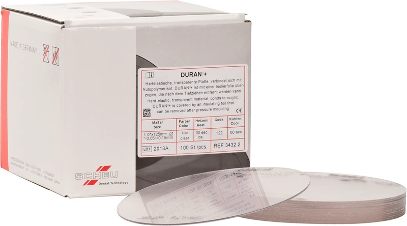 Mit der DURAN®+ wird die Produktgruppe von DURAN® um eine Tiefziehfolie mit aufgebrachter Isolierfolie ergänzt. Der Tiefziehvorgang verringert sich um einen Schritt, da vorab keine separate Isolierfolie mehr tiefgezogen werden muss. Das hartelastische, transparente Material verbindet sich gut mit Autopolymerisaten (z. B. DURASPLINT) und eignet sich für Miniplast-, Aufbiss-, Interims- sowie Fluoridierungsschienen, Röntgenschablonen, Schnarchtherapiegeräte, provisorische Kronen und Brücken.