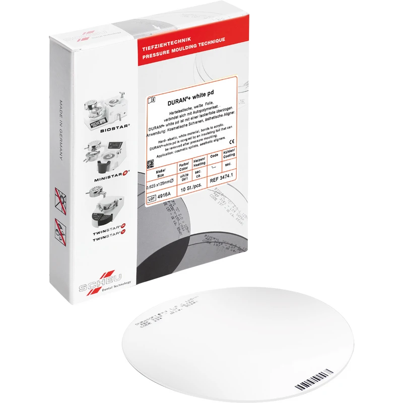 Neue Folie in bewährter DURAN® Qualität in weiß (Vita 0M1). Mit aufgebrachter Isolierfolie. Die Folien sind zum sofortigen Gebrauch bereits vorgetrocknet und einzeln vakuumverpackt.