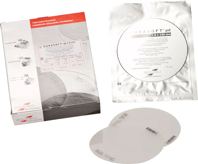 Unzerbrechliche, abrasionsfeste, transparente Verbundfolie mit einer harten und einer weichen Folienseite. Die harte Seite verbindet sich mit Autopolymerisat. Die Folien sind zum sofortigen Gebrauch bereits vorgetrocknet und einzeln vakuumverpackt. Anwendung: Miniplast-, Knirscher- und Aufbiss-Schienen, Schnarchtherapiegeräte.