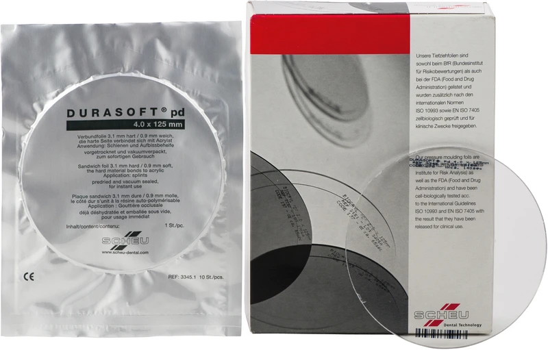 Unzerbrechliche, abrasionsfeste, transparente Verbundfolie mit einer harten und einer weichen Folienseite. Die harte Seite verbindet sich mit Autopolymerisat. Die Folien sind zum sofortigen Gebrauch bereits vorgetrocknet und einzeln vakuumverpackt. Anwendung: Miniplast-, Knirscher- und Aufbiss-Schienen, Schnarchtherapiegeräte.