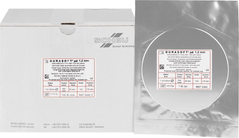 Unzerbrechliche, abrasionsfeste, transparente Verbundfolie mit einer harten und einer weichen Folienseite. Die harte Seite verbindet sich mit Autopolymerisat. Die Folien sind zum sofortigen Gebrauch bereits vorgetrocknet und einzeln vakuumverpackt. Anwendung: Miniplast-, Knirscher- und Aufbiss-Schienen, Schnarchtherapiegeräte.