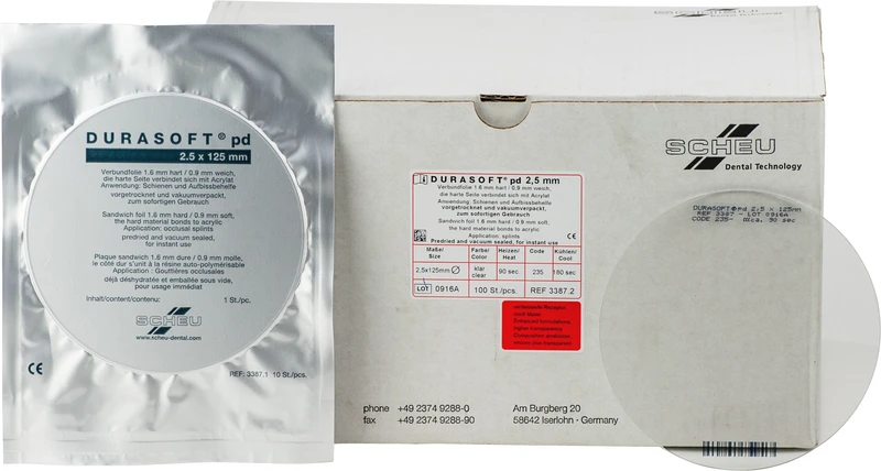 Unzerbrechliche, abrasionsfeste, transparente Verbundfolie mit einer harten und einer weichen Folienseite. Die harte Seite verbindet sich mit Autopolymerisat. Die Folien sind zum sofortigen Gebrauch bereits vorgetrocknet und einzeln vakuumverpackt. Anwendung: Miniplast-, Knirscher- und Aufbiss-Schienen, Schnarchtherapiegeräte.
