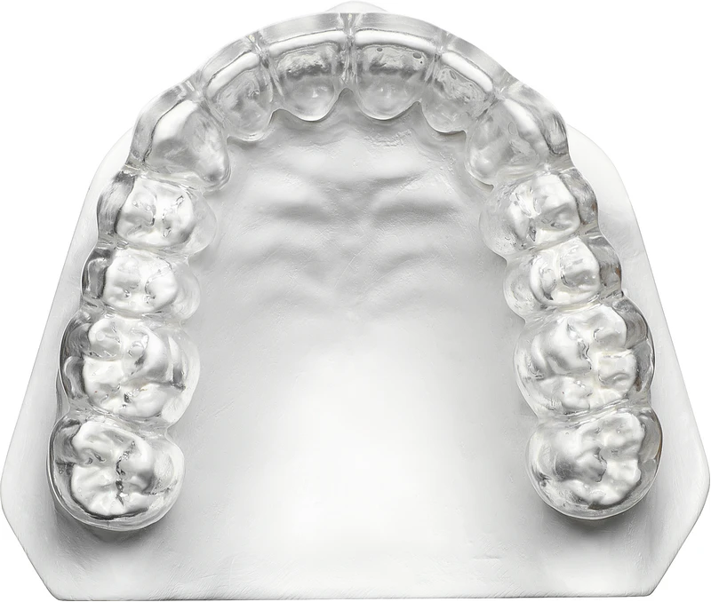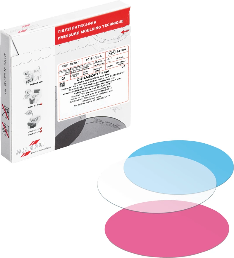 Tiefziehfolie aus TPU, die sich mit der weichen Seite von DURASOFT® pd verbindet. DURASOFT® seal bildet eine verfärbungsresistente und widerstandsfähige Innenschicht für Schienen, speziell Langzeit-Therapieschienen wie Intraorale Schnarchtherapiegeräte.