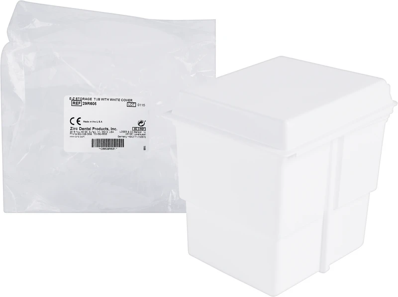 E-Z Storage Tub Kleinteile-Organizer, mit weißem Deckel (13,4 x 10,9 cm) und Trennwänden. Das Gestell des Organizers hat rutschfeste Gummifüsse. Ein gekipptes EInsetzen des Kunststoffbehälters wird ermöglicht, die Entnahme der Kleinteile so für den Behandler erleichtert.