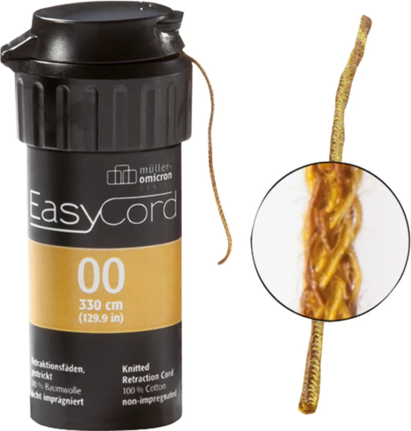 EasyCord Retraktionsfäden aus 100 % Baumwolle, gestrickt; ungetränkt, 330 cm. Das spezielle Strickmuster ermöglicht eine 30 % höhere Aufnahmekapazität durch High-Speed Absorption. Die ausgezeichnete Kompression gibt die Flüssigkeit gezielt zur Einwirkung wieder ab. Sehr gutes elastisches Verhalten sorgt für gleichmäßigen Druck und perfekten Sitz; EasyCord lässt sich leicht legen, franst nicht aus und verwickelt sich nicht in rotierende Diamantbohrer.
