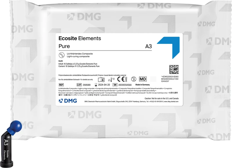 Ecosite Elements ist ein lichthärtendes Nanohybrid Composite-System für den Front- und Seitenzahnbereich, mit dem sich rund 98 % aller typischen Versorgungen meistern lassen gerade auch ästhetisch anspruchsvolle Fälle. Die intelligente Farbzusammenstellung aus maximal drei Modulen ermöglicht natürlich ästhetische Restaurationen mit jeder Technik. Dank des Push-and-Flow-Effekts lässt sich das Material sicher an den Kavitätenwänden adaptieren, anatomische Details sind exakt gestaltbar. Ecosite Elements überzeugt immer mit einer schnellen und eindrucksvollen Hochglanzpolitur und einem verblüffenden Chamäleoneffekt.
