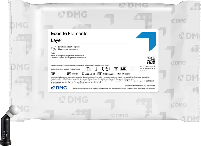 Ecosite Elements ist ein lichthärtendes Nanohybrid Composite-System für den Front- und Seitenzahnbereich, mit dem sich rund 98 % aller typischen Versorgungen meistern lassen gerade auch ästhetisch anspruchsvolle Fälle. Die intelligente Farbzusammenstellung aus maximal drei Modulen ermöglicht natürlich ästhetische Restaurationen mit jeder Technik. Dank des Push-and-Flow-Effekts lässt sich das Material sicher an den Kavitätenwänden adaptieren, anatomische Details sind exakt gestaltbar. Ecosite Elements überzeugt immer mit einer schnellen und eindrucksvollen Hochglanzpolitur und einem verblüffenden Chamäleoneffekt.