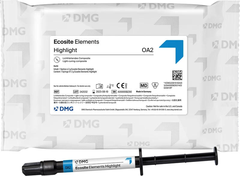 Ecosite Elements ist ein lichthärtendes Nanohybrid Composite-System für den Front- und Seitenzahnbereich, mit dem sich rund 98 % aller typischen Versorgungen meistern lassen gerade auch ästhetisch anspruchsvolle Fälle. Die intelligente Farbzusammenstellung aus maximal drei Modulen ermöglicht natürlich ästhetische Restaurationen mit jeder Technik. Dank des Push-and-Flow-Effekts lässt sich das Material sicher an den Kavitätenwänden adaptieren, anatomische Details sind exakt gestaltbar. Ecosite Elements überzeugt immer mit einer schnellen und eindrucksvollen Hochglanzpolitur und einem verblüffenden Chamäleoneffekt.