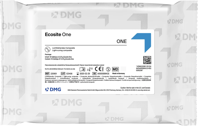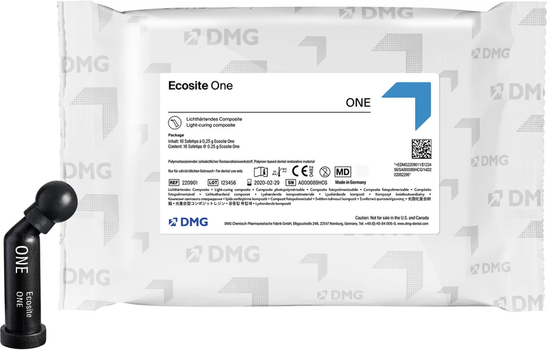 Das innovative Schicht-Composite Ecosite One setzt neue Maßstäbe in der Seitenzahnrestauration: Der Push-and-Flow-Effekt sorgt für eine exzellente Handhabung. 3 Millimeter Durchhärtetiefe und 10 Sekunden Schnellpolymerisation sparen wertvolle Zeit, während das One-Shade-Konzept eine Farbe für alle Anwendungen möglich macht einfach für den Zahnarzt, schön für den Patienten. Zweckbestimmung