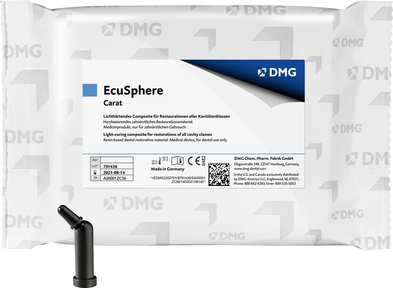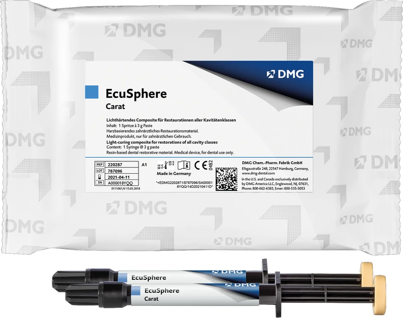 Lichthärtendes, stopfbares Seitenzahncomposite; Mit EcuSphere-Carat, einem hochviskosen, stopfbaren Composite, können dauerhafte Füllungen vorzugsweise im Posteriorbereich gelegt werden. Herstellung von direkten Inlays und Onlays. Geeignet für alle Kavitätenklassen, jedoch besonders für Klassen I und II.