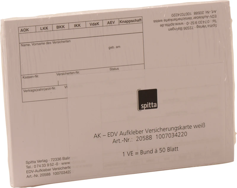 Der Aufkleber Anschriftenfeld Krankenversichertenkarte wurde speziell für die Spitta System Karteikarte für Adrema (DIN A5) entwickelt. Egal ob bei Neuanlage eines Patienten oder Änderungen der Daten einfach ausdrucken und aufkleben. Schnell einfach passgenau.