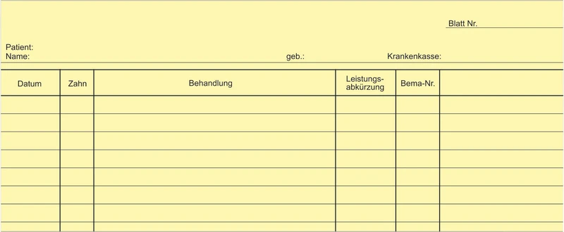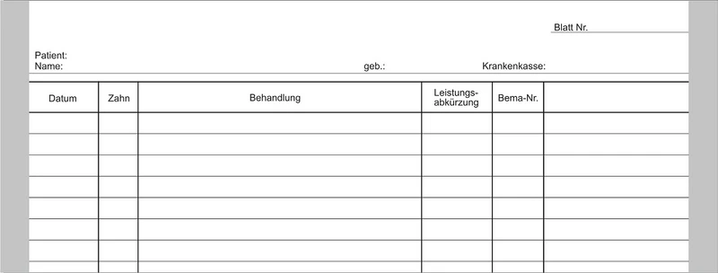 Durch die Spalten Spalten für Datum, Zahn, Behandlung und Notizen gibt es ausreichend Platz, auch zur Eintragung von BEMA-Nr..