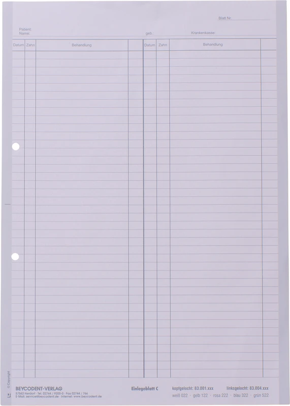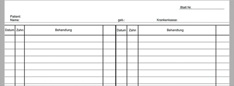 Durch die Spalten Spalten für Datum, Zahn, Behandlung und Notizen gibt es ausreichend Platz, auch zur Eintragung von BEMA-Nr..
