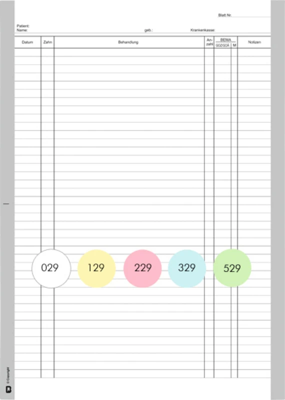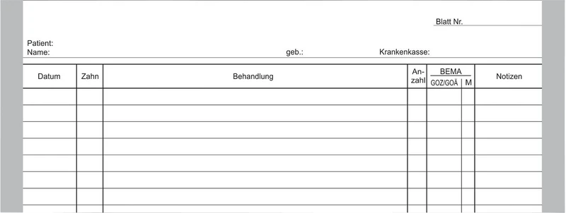 Durch die Spalten Spalten für Datum, Zahn, Behandlung und Notizen gibt es ausreichend Platz, auch zur Eintragung von BEMA-Nr..