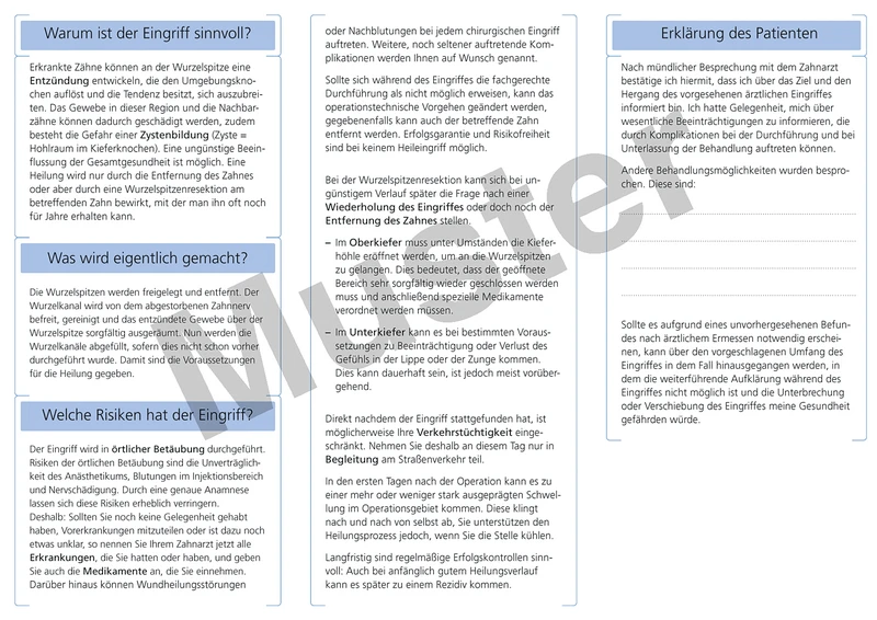 Auf dem Bogen "Einwilligung zur Wurzelspitzenresektion beim Seitenzahn" befinden sich alle wichtigen Informationen die zur Aufklärung notwendig sind.