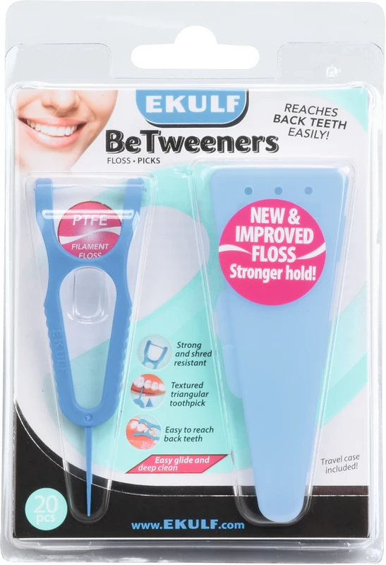 EKULF BeTweeners sorgen für einen maximalen Reinigungseffekt zwischen den Zähnen und rundherum sowie tief unten entlang des Zahnfleischs. Die Zahnseide ist ein starker und einzigartiger PTFE-Faden, der nicht ausfranst. EKULF BeTweeners gleiten leicht zwischen den Zähnen und können bei engen Zwischenräumen einfach nach unten geführt werden. EKULF BeTweeners haben ein Y-förmiges Design. Es ist einfacher, den Halter nur mit einer Hand anzuwenden. Sie gelangen so auch leichter an die hinteren Zähne (Molaren). Jede Verpackung verfügt über ein praktisches Reiseetui. Das Etui hat kleine Luftlöcher, damit eine gute Belüftung den Faden und den Halter trocknet. So bleibt alles zwischen den Anwendungen hygienisch.
