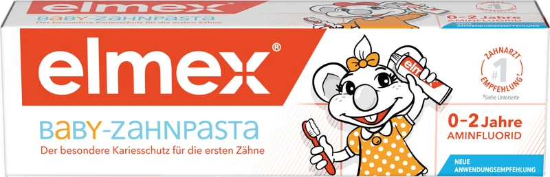 elmex® BABY-ZAHNPASTA mit 1.000 ppm Fluorid* wurde mit der Neo-Aminex Technologie zum Schutz gegen Karies entwickelt und remineralisiert den Zahnschmelz.