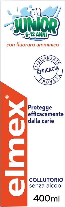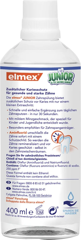 Die elmex® JUNIOR Zahnspülung vervollständigt das System aus Zahnbürste, Zahnpasta und Zahnspülung und ist speziell für Kinder zwischen 6 - 12 Jahren geeignet. Sie bietet einen zusätzlichen Kariesschutz für die Entwicklungszeit der Kinder, in denen das Kariesrisiko besonders hoch ist.