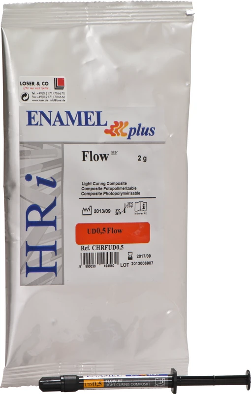 Das ENAMEL plus HRi® Flow weist einen enorm hohen Füllstoffgehalt von 77 % auf. Es ist stark fluoreszent und hat eine sehr hohe Viskosität und Elastizität. Es überzeugt zudem aufgrund der hervorragenden Röntgensichtbarkeit und den überragenden physikalischen Eigenschaften. Des Weiteren wird eine Luftblasenbildung sicher vermieden.