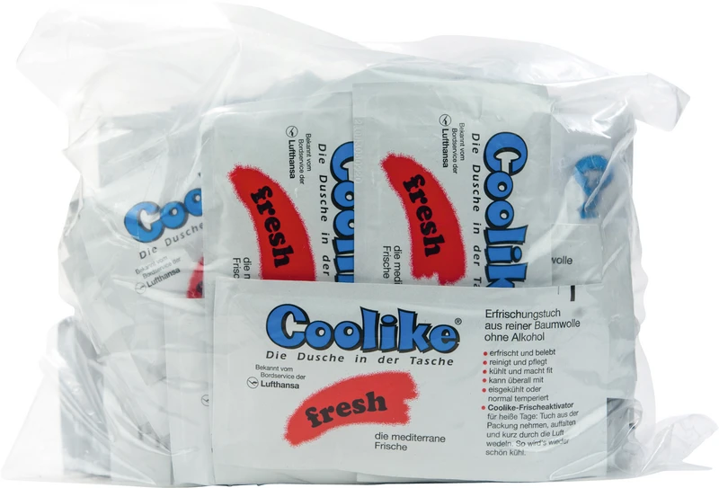 Coolike-Frischeaktivator für heiße Tage. Tuch aus der Packung nehmen, auffalten und kurz durch die Luft wedeln. So wird´s wieder schön kühl. Original Erfrischungstücher aus weicher Baumwolle, ohne Alkohol.
