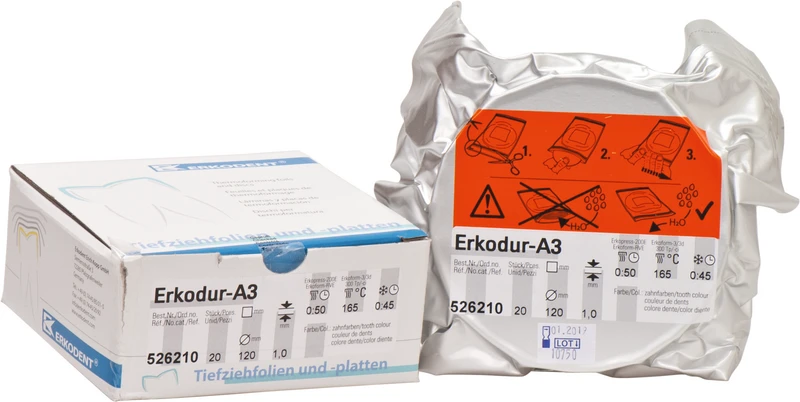 Am besten mit unserem Ausarbeitungsset Quick-II (110877) ausarbeiten. Material ist mit Kunststoffpoliermitteln hochglanzpolierbar. Isolierfolie wird erst nach dem Tiefziehen und Ausarbeiten entfernt. Zähharte Folie. Äußerst schlagzäh. Sehr gut tiefziehbar. Verbindet sich mit Autopolymerisat. Chemische Charakterisierung: Copolyester, PETG / Isolierfolie: Polyethylen, PE . Gesundheitlich unbedenkliche, BgVV-gelistetet Thermoplaste mit geprüfter Biokompatibilität. Wasserunlöslich, inaktiv, keine Gefahr für das Grundwasser.
