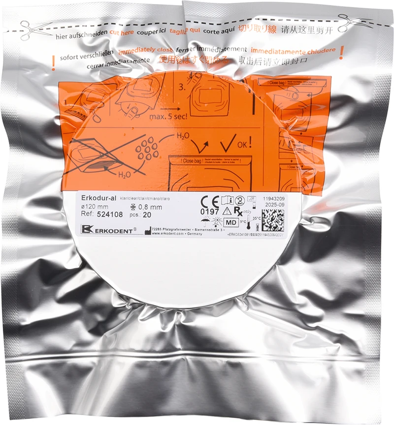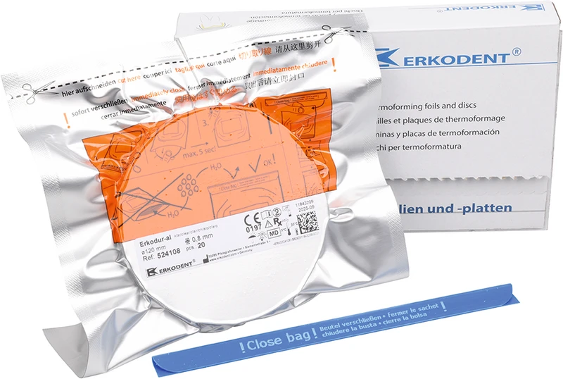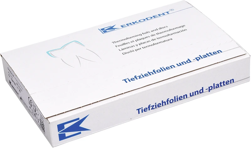 Glasklare zähelastisch-harte und bruchfeste Tiefziehfolie (PET-A) mit Isolierfolie und hervorragender Formstabilität. Erkodur-al ist ein für die Herstellung von Alignern optimiertes Folienmaterial. Im Vergleich zu dem bewährten Erkodur ist das Material circa 35 % weicher mit entsprechend geringerer Initialkraft und Spannungsgefühl bei der Eingliederung. Durch die sehr flach verlaufende Memory Verlustkurve hält die wirksame Kraft von Erkodur-al vergleichsweise länger an.