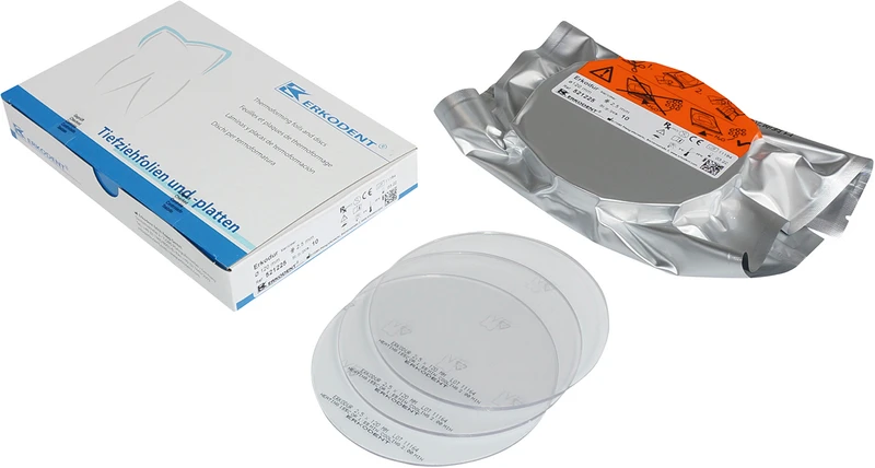 Erkodur ist eine zähharte, glasklare Folie. Äußerst schlagzäh. Sehr gut tiefziehbar. Verbindet sich mit Autopolymerisat. Kein Vortrocknen nötig. Mit Unterziehfolie als Schrumpfausgleichs- und Isolierfolie für Aufbiss-, Knirscher-, Stabilisierungs-, Drum- und Miniplastschienen, Verbandplatten, Gussformteilen.