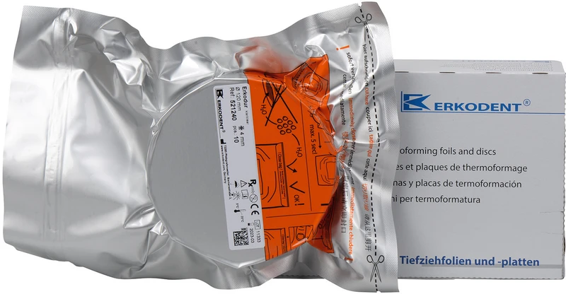 Erkodur ist eine zähharte, glasklare Folie. Äußerst schlagzäh. Sehr gut tiefziehbar. Verbindet sich mit Autopolymerisat. Kein Vortrocknen nötig. Mit Unterziehfolie als Schrumpfausgleichs- und Isolierfolie für Aufbiss-, Knirscher-, Stabilisierungs-, Drum- und Miniplastschienen, Verbandplatten, Gussformteilen.