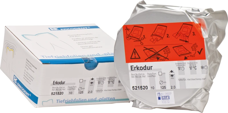 Erkodur ist eine zähharte, glasklare Folie. Äußerst schlagzäh. Sehr gut tiefziehbar. Verbindet sich mit Autopolymerisat. Kein Vortrocknen nötig. Mit Unterziehfolie als Schrumpfausgleichs- und Isolierfolie für Aufbiss-, Knirscher-, Stabilisierungs-, Drum- und Miniplastschienen, Verbandplatten, Gussformteilen.