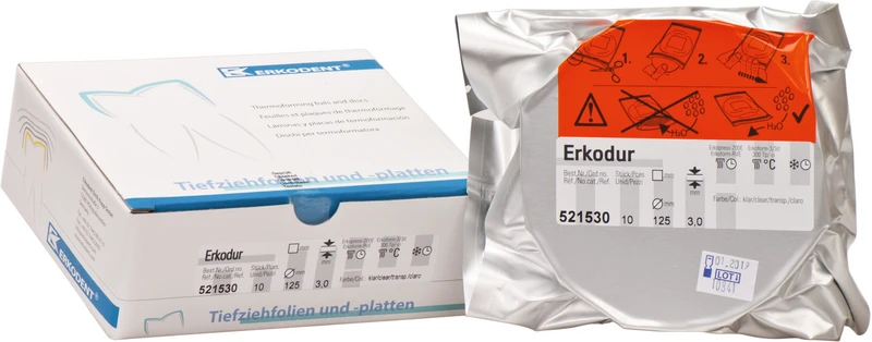 Erkodur ist eine zähharte, glasklare Folie. Äußerst schlagzäh. Sehr gut tiefziehbar. Verbindet sich mit Autopolymerisat. Kein Vortrocknen nötig. Mit Unterziehfolie als Schrumpfausgleichs- und Isolierfolie für Aufbiss-, Knirscher-, Stabilisierungs-, Drum- und Miniplastschienen, Verbandplatten, Gussformteilen.