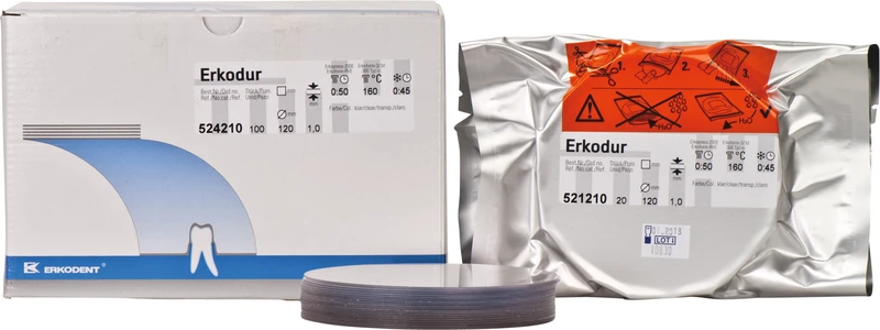 Erkodur ist eine zähharte, glasklare Folie. Äußerst schlagzäh. Sehr gut tiefziehbar. Verbindet sich mit Autopolymerisat. Kein Vortrocknen nötig. Mit Unterziehfolie als Schrumpfausgleichs- und Isolierfolie für Aufbiss-, Knirscher-, Stabilisierungs-, Drum- und Miniplastschienen, Verbandplatten, Gussformteilen.