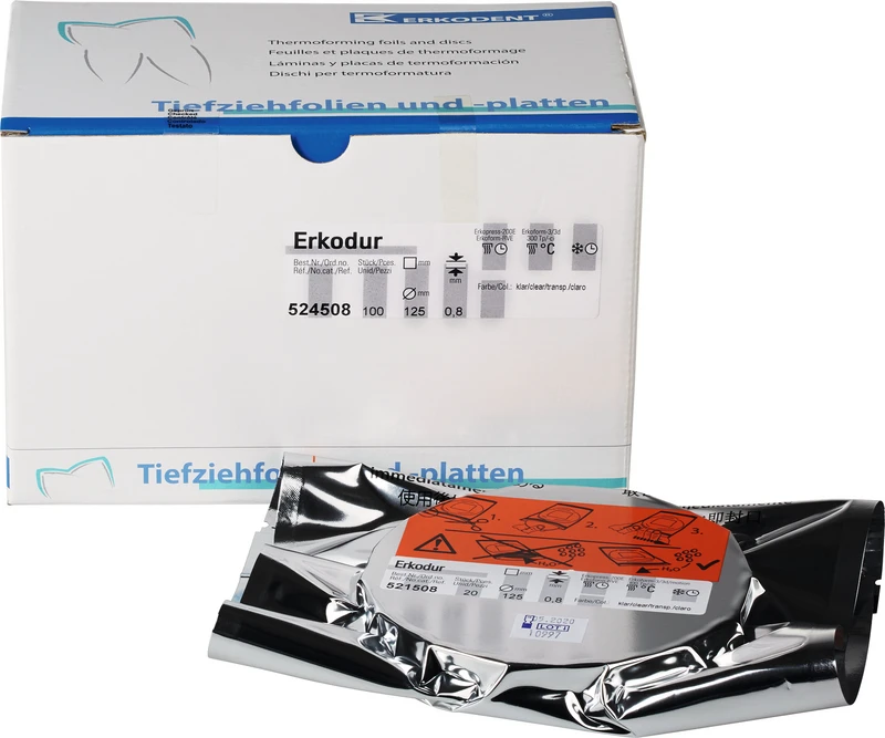 Erkodur ist eine zähharte, glasklare Folie. Äußerst schlagzäh. Sehr gut tiefziehbar. Verbindet sich mit Autopolymerisat. Kein Vortrocknen nötig. Mit Unterziehfolie als Schrumpfausgleichs- und Isolierfolie für Aufbiss-, Knirscher-, Stabilisierungs-, Drum- und Miniplastschienen, Verbandplatten, Gussformteilen.