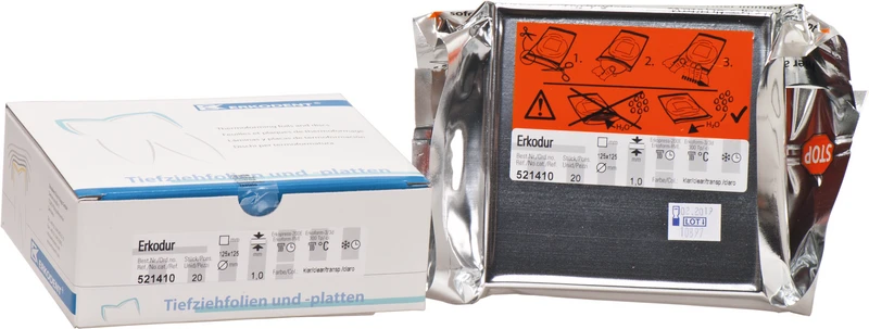 Erkodur ist eine zähharte, glasklare Folie. Äußerst schlagzäh. Sehr gut tiefziehbar. Verbindet sich mit Autopolymerisat. Kein Vortrocknen nötig. Mit Unterziehfolie als Schrumpfausgleichs- und Isolierfolie für Aufbiss-, Knirscher-, Stabilisierungs-, Drum- und Miniplastschienen, Verbandplatten, Gussformteilen.