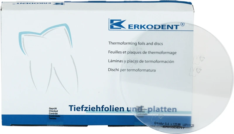 Erkodur ist eine zähharte, glasklare Folie. Äußerst schlagzäh. Sehr gut tiefziehbar. Verbindet sich mit Autopolymerisat. Kein Vortrocknen nötig. Mit Unterziehfolie als Schrumpfausgleichs- und Isolierfolie für Aufbiss-, Knirscher-, Stabilisierungs-, Drum- und Miniplastschienen, Verbandplatten, Gussformteilen.