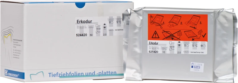 Erkodur ist eine zähharte, glasklare Folie. Äußerst schlagzäh. Sehr gut tiefziehbar. Verbindet sich mit Autopolymerisat. Kein Vortrocknen nötig. Mit Unterziehfolie als Schrumpfausgleichs- und Isolierfolie für Aufbiss-, Knirscher-, Stabilisierungs-, Drum- und Miniplastschienen, Verbandplatten, Gussformteilen.